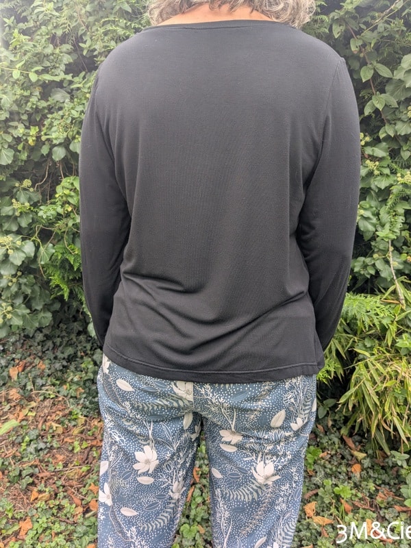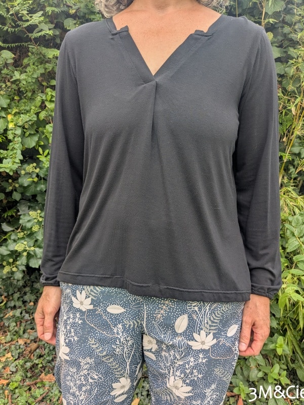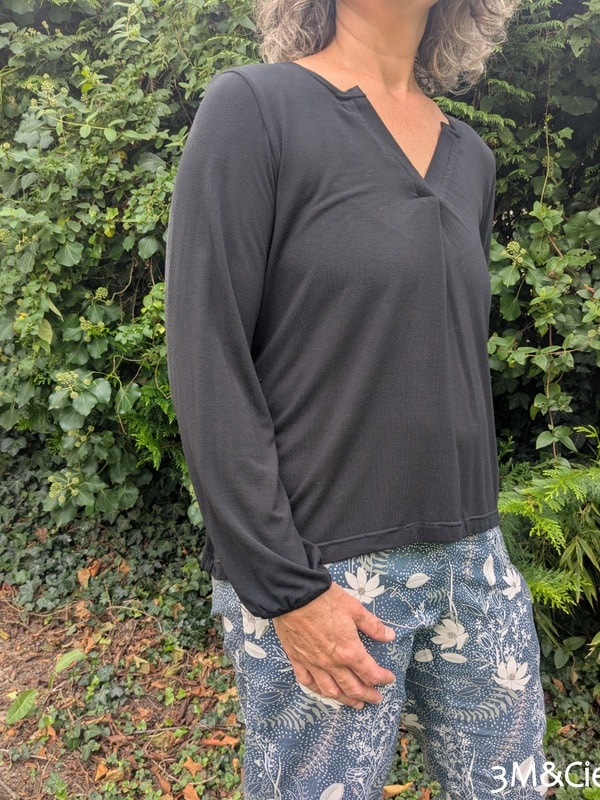 Patron : Top Maly de Moi je couds, taille 40. Modifications apportés : longueur réduite de 5 cm, manches allongées de 9 cm pour des manches longues et réduites de 4,5 cm au niveau du poignet.